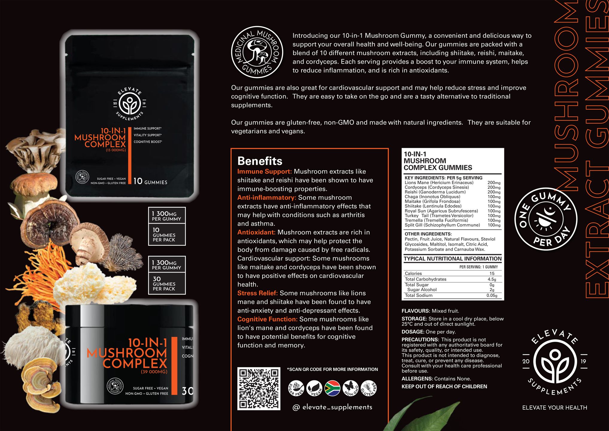 Introducing our 10-in-1 Mushroom Gummy, a convenient and delicious way to support your overall health and well-being. Our gummies are packed with a blend of 10 different mushroom extracts, including shiitake, reishi, maitake, and cordyceps. Each serving provides a boost to your immune system, helps to reduce inflammation, and is rich in antioxidants.
